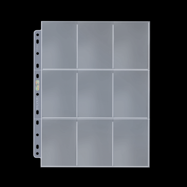 Ultra PRO Silver Series Pages in nine-pocket style. Archival quality pages that holds standard sized cards with 2-1/2" X 3-1/2" dimensions or smaller. Pages are clear on both sides with 11-hole punched on the spine for flexible binding.