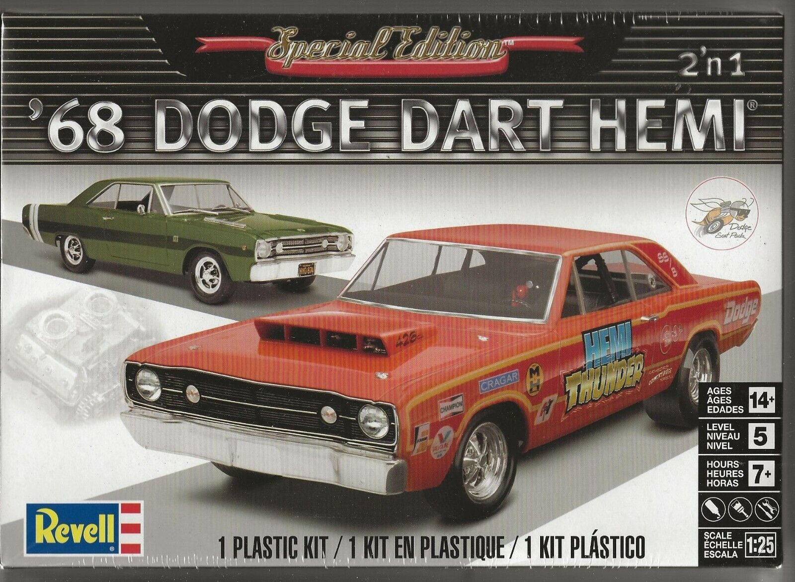 The 1968 Dodge Dart was already really cool with its 7.2-liter engine, but Chrysler made even cooler, ultra-high-performance Dart models in limited numbers that were equipped with a HEMI® engine. These were lightweight Dart GTS sedans, and Chrysler commented that these models were "intended for use in supervised acceleration testing and not for general street use." They also came without a warranty. Optional 7-liter HEMI engine with two carburetors or 7.2-liter engine with one carburetor Production model interior, -hood, -wheels -suspension or racing model interior, -suspension, -hood with attachment and treadless racing tires Decal with factory production model lettering as well as drag racing motifs Molded from white, transparent red and translucent material, with chrome plated parts and elastic black tires Scale:1:25 Age:14+ Number of parts:172 Length:203 mm