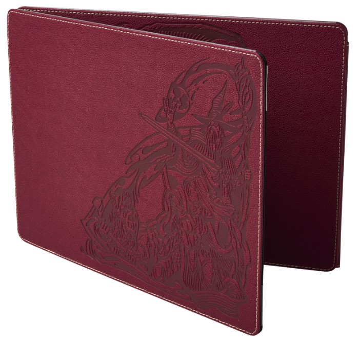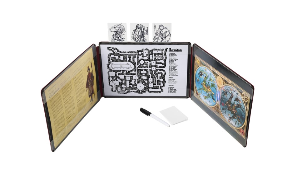 Let epic stories unfold as brave adventurers dive into your world of grand quests and exploration. Never lose track of turn order and oversee your secret notes as the plot thickens behind this elegant customizable Game Master Screen. The integrated initiative tracker lets you streamline combat sessions with clearly visible initiative order for the whole table. Use the included cards and dry erase marker to create PC, NPC and monster cards. The Game Master Screen sits at a pleasant ergonomic height giving you a comfortable view of the adventures that unfold even while seated, ample space for sheltering reference notes, rules, maps and more behind the screen. Includes: Dragon Shield mini adventure 18 reusable plastic cards and dry erase marker Features: Ergonomic height Integrated initiative tracker Subtle and elegant embossing Panels hold letter and A4 size paper Durable blood red Dragon Skin exterior The GM screen’s dimensions when open straight are 96 by 23 cm (37.8 x 9"). Measures 13.5 x 23 x 1.7 cm (5.3 x 9 x 0.7") when folded shut.