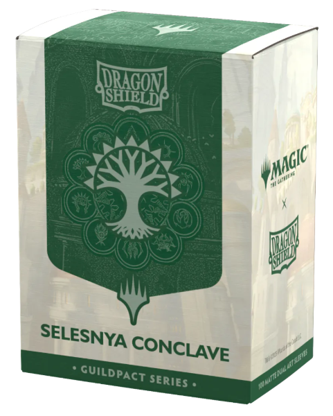 The Guildpact series celebrates the ten iconic guilds of Ravnica. Each sleeve features their guild symbol in exquisite metallic print on a subtle background based on the Guildgate artwork. The back and interior of the sleeves use the guild’s colors to perfectly match both the guild and your deck.