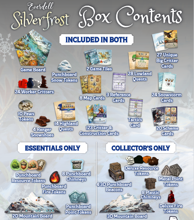 Note: The Silverfrost box is slightly deeper than the Everdell and Farshore boxes to accommodate the assembled 3D mountain, which is in both versions.