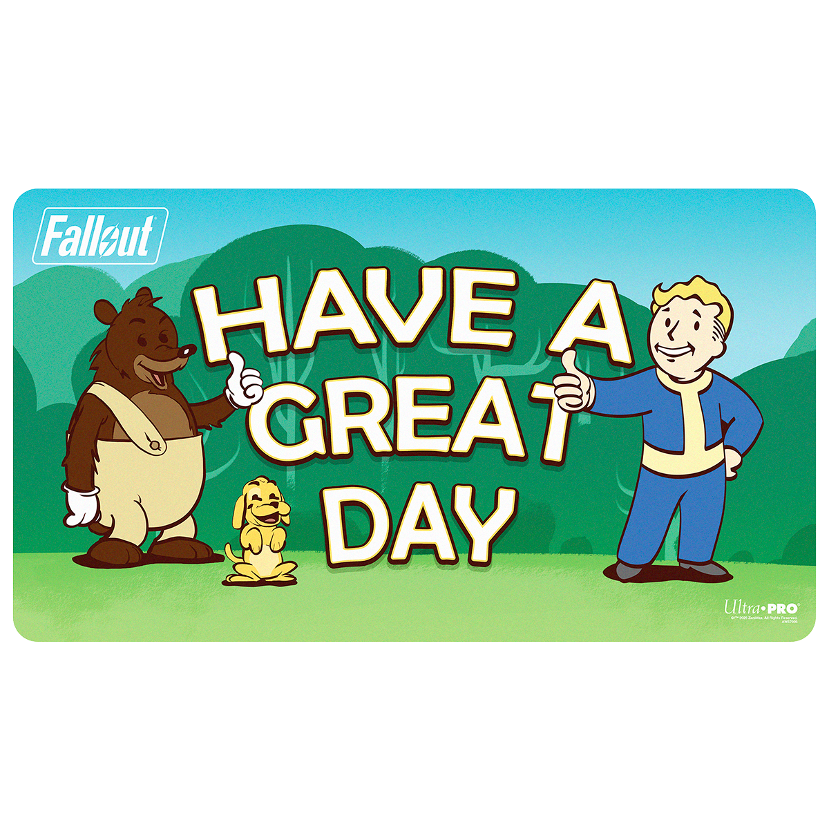 The Fallout - Vault Boy - Have a Great Day Playmat features vibrant, full-color artwork. Made with a soft fabric top, playmats provide a safe gameplay surface, and a non-slip rubber backing keeps the playmat in place. With dimensions of approximately 24 in. x 13.5 in., a playmat also makes an excellent oversize mousepad for home or office.