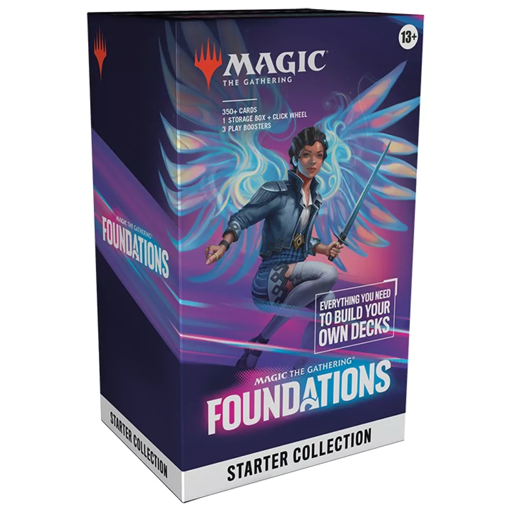 This Foundations Starter Collection contains everything you need to build your own Magic: The Gathering decks and establish a solid foundation to any Magic card collection, including over 350 cards with essential staples for any color and any way you want to play. Enjoy old and new favorites alike as you build your first—or your fiftieth—deck with included tutorials and expert recommendations. Each Foundations Starter Collection includes 26 Traditional Foil cards, 361 regular cards (including 90 Lands, 10 of which are Full-Art), 3 Play Boosters (each containing 14 cards), 13 double-sided tokens, 1 Deck Builder’s Guide booklet, 2 reference cards, 1 click-wheel life counter, and 1 card storage box.