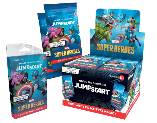 Le Jumpstart Booster Display Marvel Super Heroes est un coffret de 24 boosters du jeu Magic: The Gathering, inspirés de l’univers Marvel. Chaque booster contient un mini-deck thématique de 20 cartes (avec les terrains inclus) que l’on peut mélanger avec un autre booster pour jouer immédiatement, sans avoir besoin de construire un deck. Ce produit est idéal pour des parties rapides, pour les débutants comme pour les fans de Marvel.