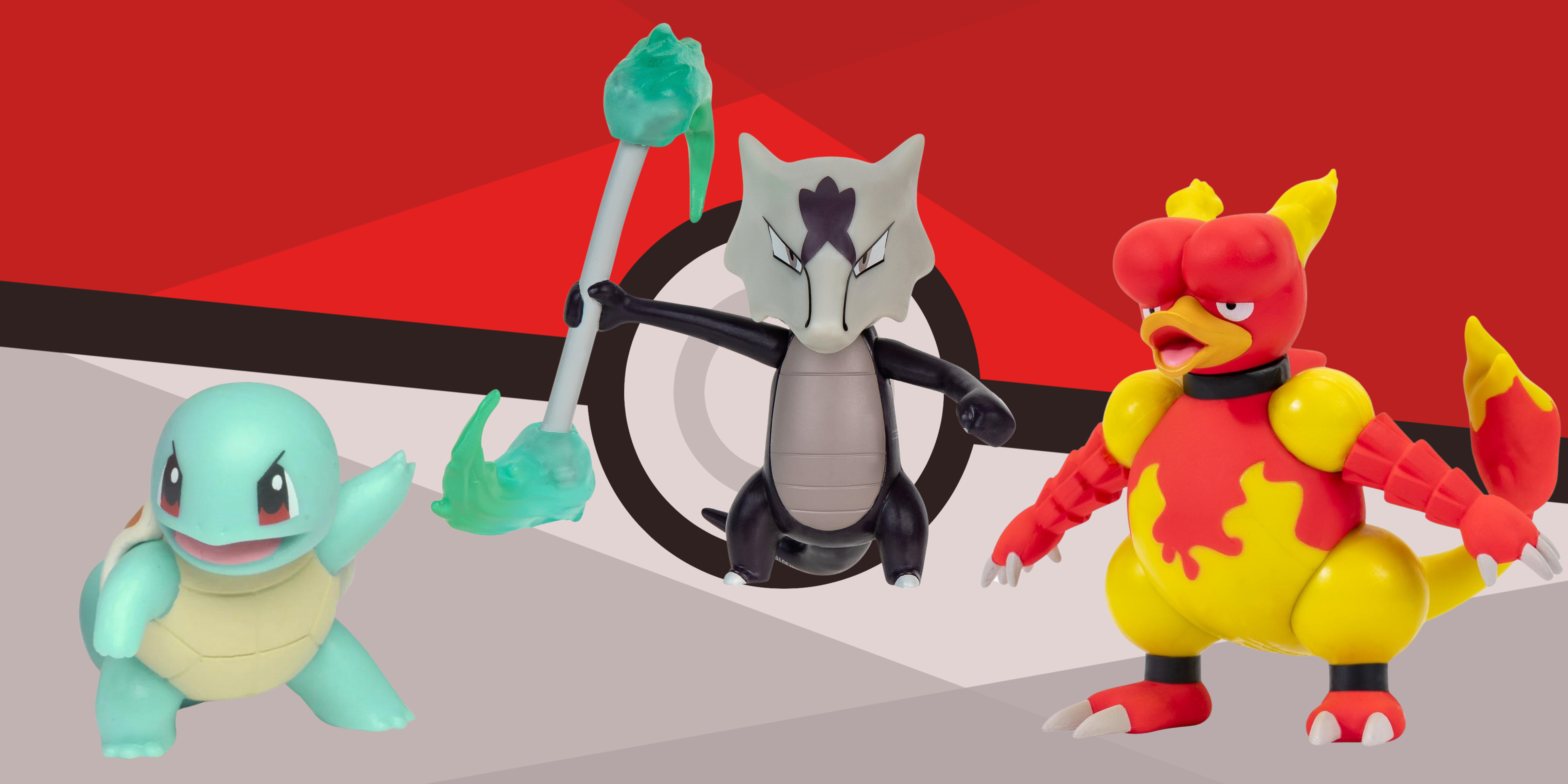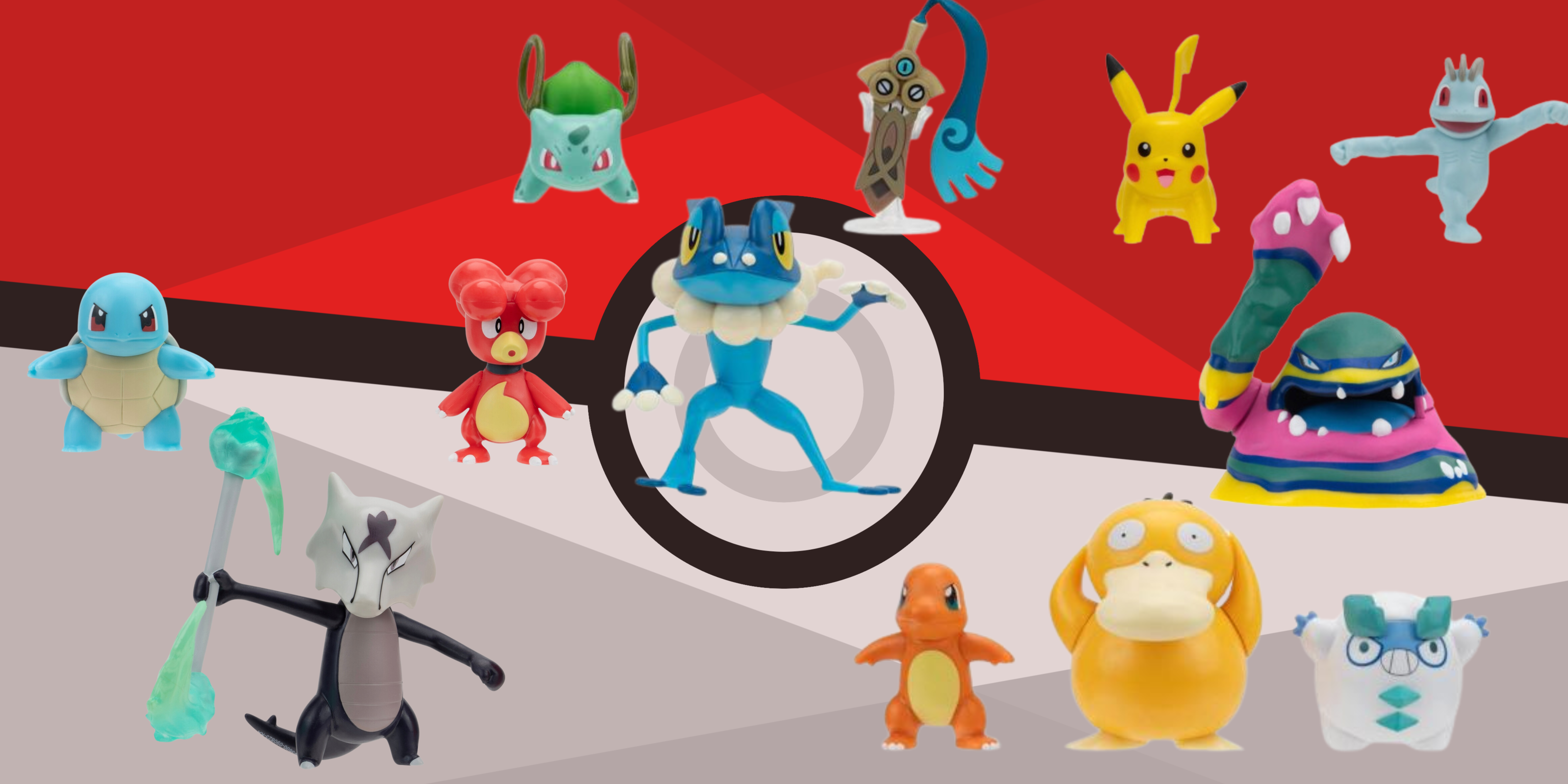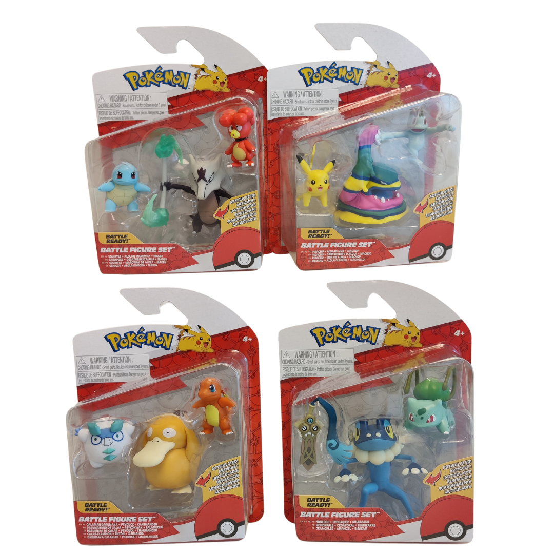 This assortment contains : 1X Pokémon Battle Figure Set - Machop, Pikachu #1, Alolan Muk 1X Pokémon Battle Figure Set - Charmander #4, Galarian Darumaka, Psyduck 1X Pokémon Battle Figure Set - Honedge with Stand, Bulbasaur #4, Frogadier 1X Pokémon Battle Figure Set - Magby, Squirtle #4, Alolan Marowak
