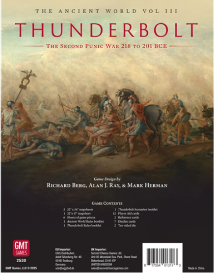 Thunderbolt brings The Ancient World system to the mammoth 2nd Punic War. The game covers the action in the Western Mediterranean on updated Italy and Africa maps published in the prior two volumes, plus a connecting full-size map of Spain and western Mauretania, the last map design of Richard’s long and illustrious career.