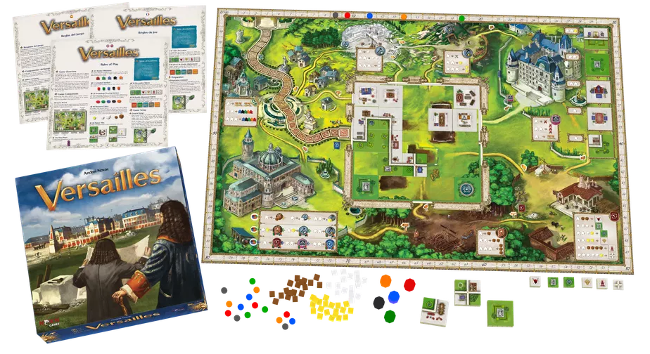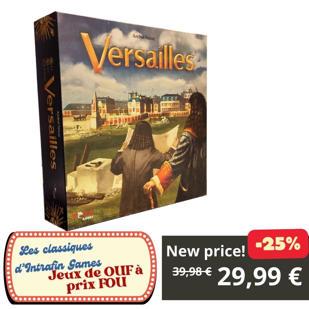 VERSAILLES est un jeu de société original où les joueurs incarnent des architectes et des décorateurs travaillant ensemble à la réalisation du château de Versailles. Ils doivent rivaliser d’audace pour obtenir les faveurs du Roi Louis XIV. Lors de son tour, un joueur déplace un ou plusieurs ouvriers sur le réseau du plateau puis active le lieu où ils terminent leur déplacement. Cela lui permet d'obtenir des ressources, des tuiles ou d'apprendre de nouvelles compétences. Fort de tout cela, les joueurs construiront des pièces dans le dédale du palais, aménageront les somptueux jardins et ajouteront des décorations impressionnantes et luxurieuses. En fin de partie, Sa Majesté viendra récompenser le serviteur qui l’aura le mieux servi.