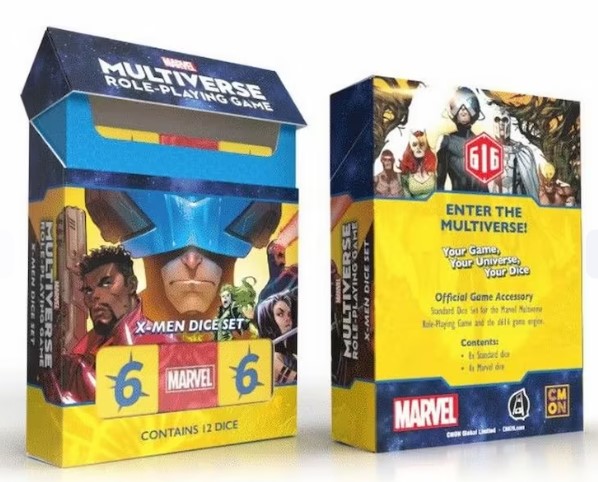 The Dice are created to bring the fullest heroic immersion to the table when playing the Marvel Multiverse Role-Playing game and their new X-Men expansion. The Blue Dice marble texture reminds of the Tesseract infinite energy. This is the very special dice with the Marvel logo replacing the “1” face, so that the player can roll the most effective results. The Yellow Dice is sculpted as the numbers had been mightily pummeled down, cracking the concrete with their force. These dice were built not just to play the game, but to enjoy the game and to share that enjoyment with the other players, as a true team of mutant superheroes. Contents: 12x Dice 8x Standard Dice 4x Marvel Dice